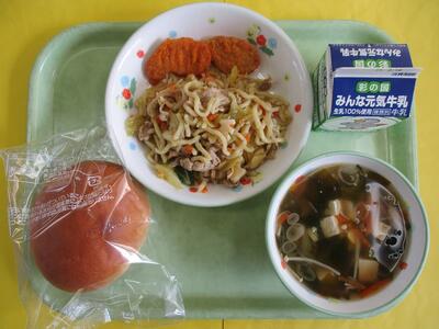 【今日のメニュー】牛乳 こどもパン 塩焼きそば チキンナゲット わかめスープ