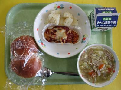 【今日のメニュー】牛乳 はちみつパン チーズオンハンバーグ 粉ふきいも アルファベットスープ