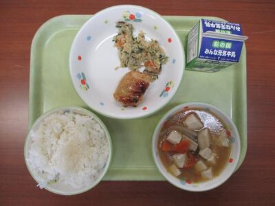 【今日のメニュー】牛乳 ごはん 鶏肉のみそマヨネーズ焼き 卯の花炒め のっぺい汁