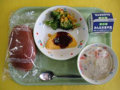 【今日のメニュー】牛乳 黒パン オムレツのケチャップソースかけ ブロッコリーとコーン 長ネギのクリームスープ