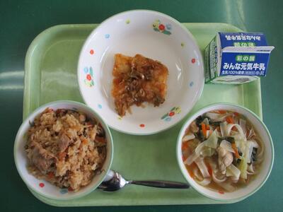 1 月24日~30日までは全国学校給食週間です。今日は学校給食の始まり献立です。日本の学校給食は明治22年、山形県の小学校で、お弁当を持ってこられない児童に給食を無料で提供したのがはじまりとされています。日本で初めて提供された給食は「おにぎり・焼き魚・漬物 」でした。今では伝統的な郷土料理や行事食など、献立も多彩になり様々な食材が使われています。