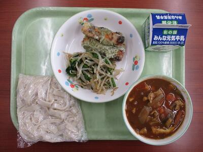 【今日のメニュー】牛乳 カレーうどん ちくわの磯部揚げ 菜の花のおひたし