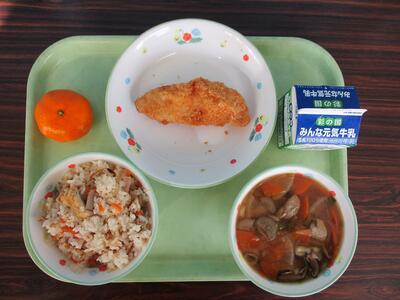 【今日のメニュー】牛乳 ほたてのバターしょうゆご飯 めばるフライ せんべい汁 みかん