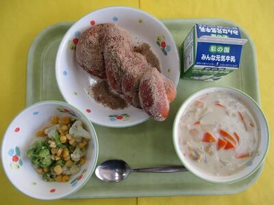 【今日のメニュー】牛乳 キャラメル揚げパン クラムチャウダー フラワーサラダ