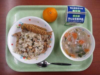 【今日のメニュー】牛乳 中華風青菜ご飯 いわしのカリカリフライ トックスープ みかん