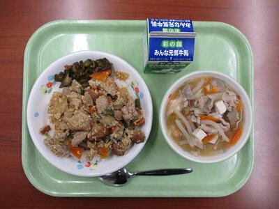 【今日のメニュー】牛乳 油麩丼 きゅうりの漬物 豚汁