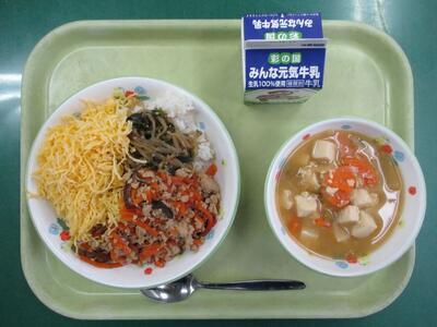 【今日のメニュー】牛乳 三色そぼろ丼 呉汁