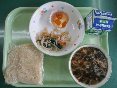 【今日のメニュー】牛乳 豆腐ラーメン もやしのナムル もものマフィン