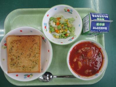 【今日のメニュー】牛乳 ガーリックトースト 鶏肉のトマト煮 えだまめサラダ