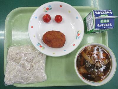 【今日のメニュー】牛乳 なすのつけ汁うどん ゼリーフライ ミニトマト