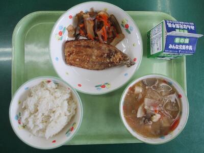 【今日のメニュー】牛乳 ごはん マスの味噌マヨネーズ焼き 大豆の磯煮 雷汁