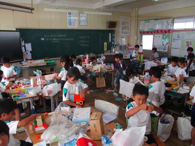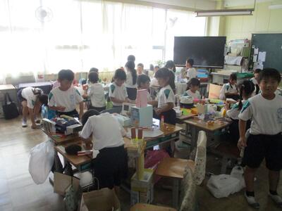 1年生が持ってきた箱と箱を組み合わせ、動物や乗り物、建物など、思い思いの工作をしていました。飾り付けのセンスもなかなかいい1年生です。