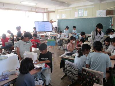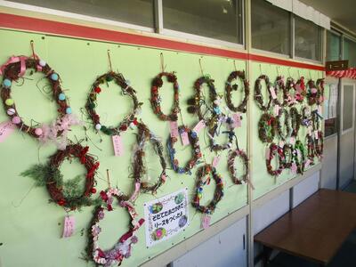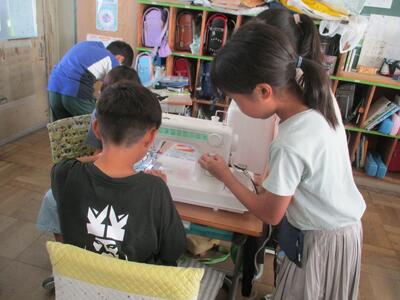 1年生の廊下の「あさがお」リース、5年生のミシン学習(ランチョンマットを作っています)、図書室前の秋掲示です。