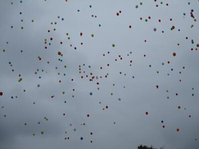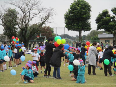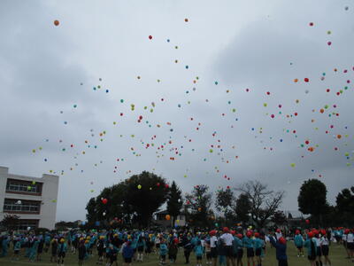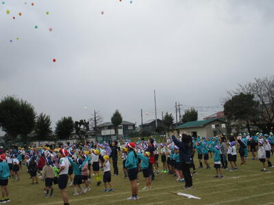 50周年記念イベントの第1弾として、運動会の閉会式終了後に全校児童でバルーンリリースを行いました。この時間には雨も小休止。一斉に上がったカラフルなバルーンが大空に吸い込まれていきました。