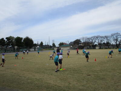 最初は簡単な動きやダッシュ遊びを行い、その後ドリブル練習、最後には広い芝生の校庭を使った3ボールのゲームが行われました。スタッフのお二人がとても楽しく進行してくれたので、子どもたちみんなが笑顔で「サッカー」に触れることができました。プロの技を体感する機会もあり、思い出に残る時間となりました。