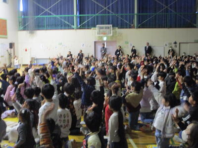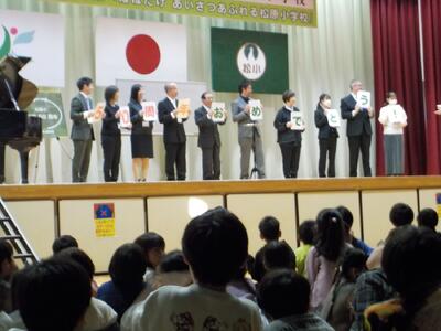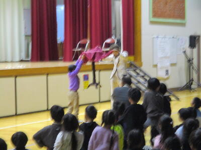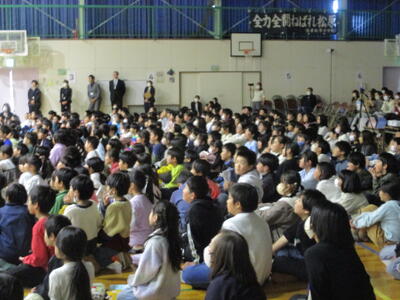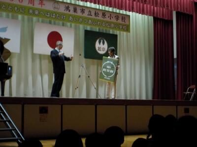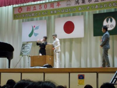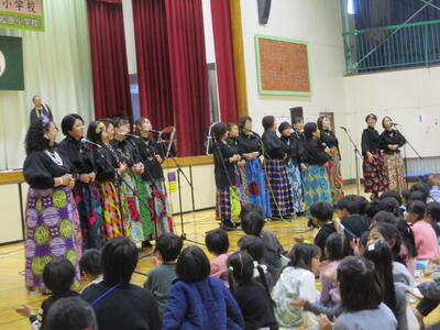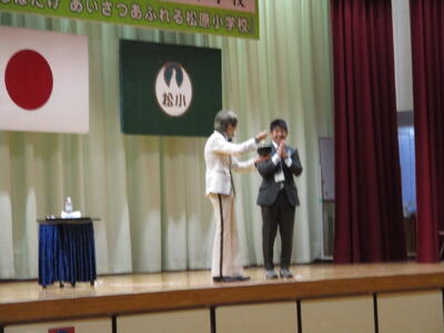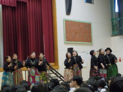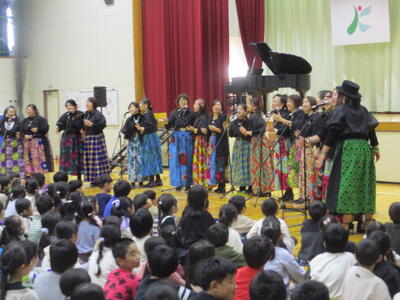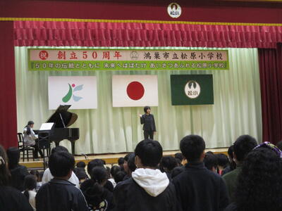 ゴスペルグループ「Viva La Vida(リーダー・飯山百香さん)」によるステージは、エネルギーあふれるメンバーの皆さんから、明るく元気になる曲をたくさんご披露いただき、松原っ子も思わず手拍子でリズムをとりたくなってしまう、会場が一つになった素敵なショーでした。最後には一緒に「ビリーブ」と「校歌」を歌いましたが、松原っ子の元気な声が体育館中に響いていました。