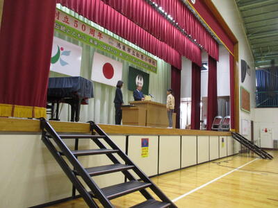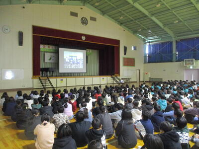 最後に50周年記念で作成してスライドを上映しました。子どもたちの笑顔、そして松原っ子を支えている地域の方々のありがたさが印象的なスライドでした。子どもたちはスクリーンをじっと見つめ、最後は大きな拍手がおこりました。