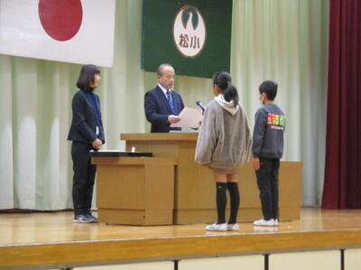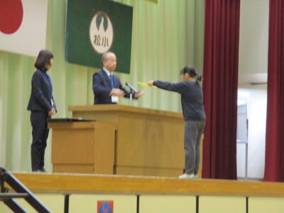今日の朝は、夏から秋にかけての様々なコンクール等の表彰を行いました。代表者がステージに上がり、校長から賞状をしっかり両手で受け取っていました。頑張った子どもたちに拍手です。