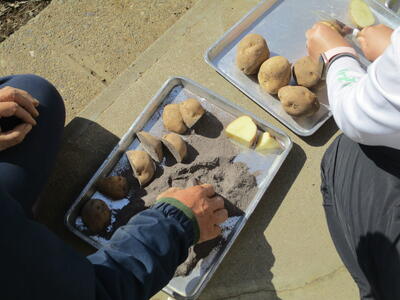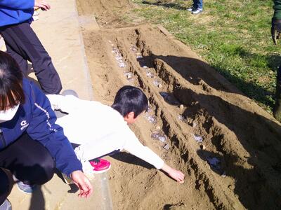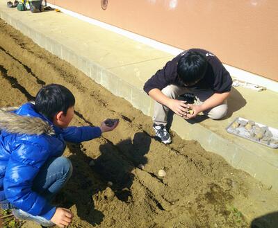〇「松の実学級 じゃがいもの植え付け」 種芋をカットして切り口に灰をつけ、畝を作った畑に植え込みました。土もよく陽当たりもよい松の実畑で、きっとおいしいじゃがいもがなることでしょう。
