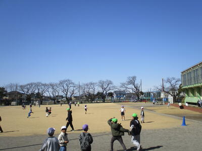 〇「ロング昼休み」 子どもは風の子を地で行く松原っ子。強風をむしろ楽しむように多くの子ども達が校庭で思い思いの遊びに励んでいました。