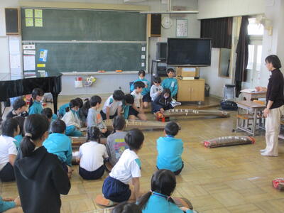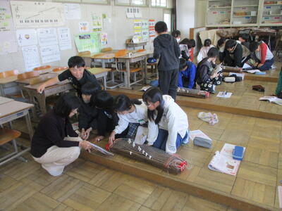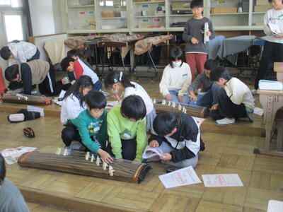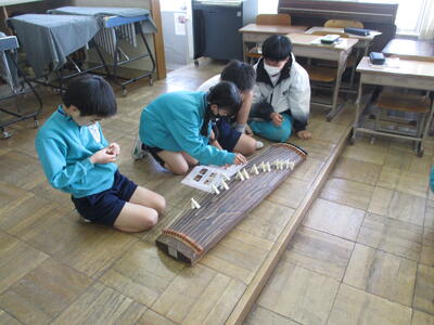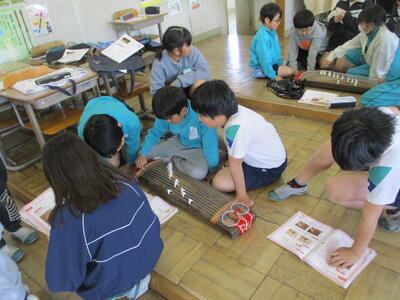 4年生が音楽で日本の楽器の授業として、ゲストティーチャーの先生をお招きして、お箏の体験学習を行いました。初めてお箏に触れる子どもたちがほぼ全員でしたので、初めは恐る恐るの演奏でしたが、最後にはグループで「さくらさくら」の調べを美しく演奏していました。とても貴重な体験でした。