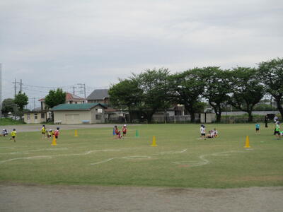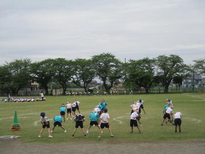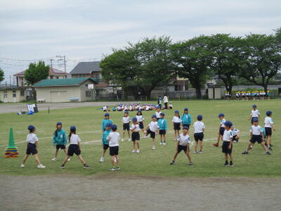 校庭では2年生が「くねくねリレー」を楽しんでいました。「がんばれ~!」の声援が毎日校庭に響いています。体育係さんを先頭にしっかり準備体操をしているクラスもありました。