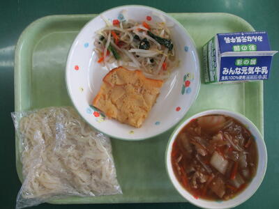 【今日のメニュー】牛乳 かんとんめん もやしと小松菜のナムル アップルケーキ