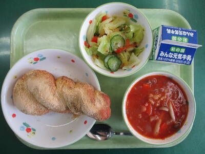 【今日のメニュー】牛乳 きな粉揚げパン 鶏肉のトマト煮 イタリアンサラダ