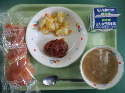 【今日のメニュー】牛乳 ツイストパン ハンバーグのケチャップソースがけ コーンポテト オニオンスープ