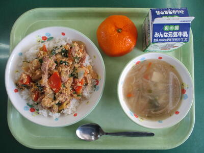 【今日のメニュー】牛乳 キム玉丼 大根としめじの中華スープ みかん