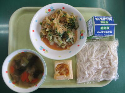 【今日のメニュー】牛乳 ねぎまうどん 白菜と水菜のサラダ 芋きんとんパイ