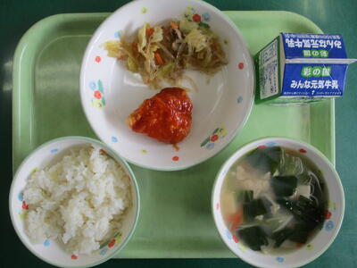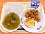 【今日のメニュー】牛乳 ごはん ヤンニョムチキン 春雨炒め チンゲン菜とあさりのスープ