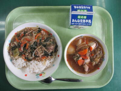 【今日のメニュー】牛乳 小松菜豚みそ丼 けんちん汁