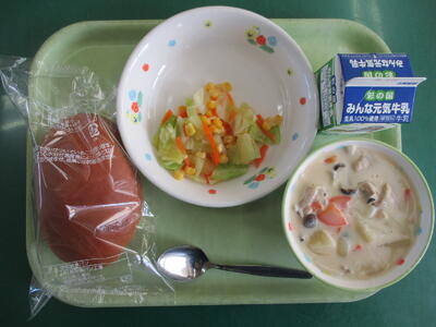 【今日のメニュー】牛乳 黒パン じゃがいものクリーム煮 コールスローサラダ